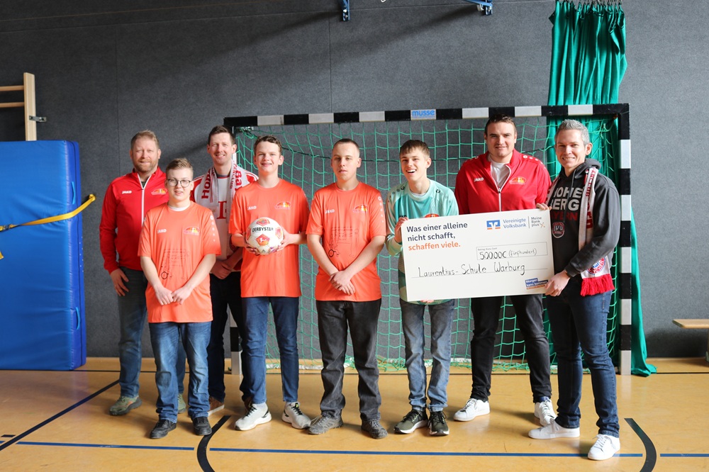Ende Februar kamen Manuel Dierkes und Christian Dierkes als Vertreter des 2014 gegründeten Fanclubs in die Turnhalle der Laurentius-Schule und überreichten den symbolischen Scheck über 500,- € sowie die Trikots mit dem Logo der Schule.